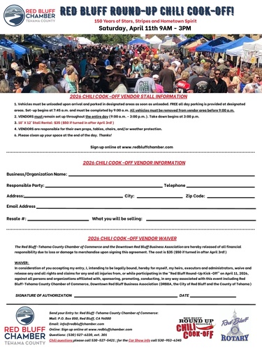 Chili Contest Registration: Penny Johnson, 530-736-3044; Vendor Registration: Jason ~ Red Bluff Chamber, 530-527-6220 x301